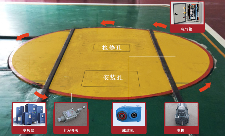 轉(zhuǎn)盤平臺(tái)一般為鋼制,選用優(yōu)質(zhì)鋼材焊接組成。平臺(tái)的直徑、高度、結(jié)構(gòu)等根據(jù)制造標(biāo)準(zhǔn)要求及用戶需要特別設(shè)計(jì),軌道裝在平臺(tái)上,通過行走裝置在地軌上實(shí)現(xiàn)正反向旋轉(zhuǎn)。為方便吊裝,在平臺(tái)兩側(cè)設(shè)置了起吊孔。